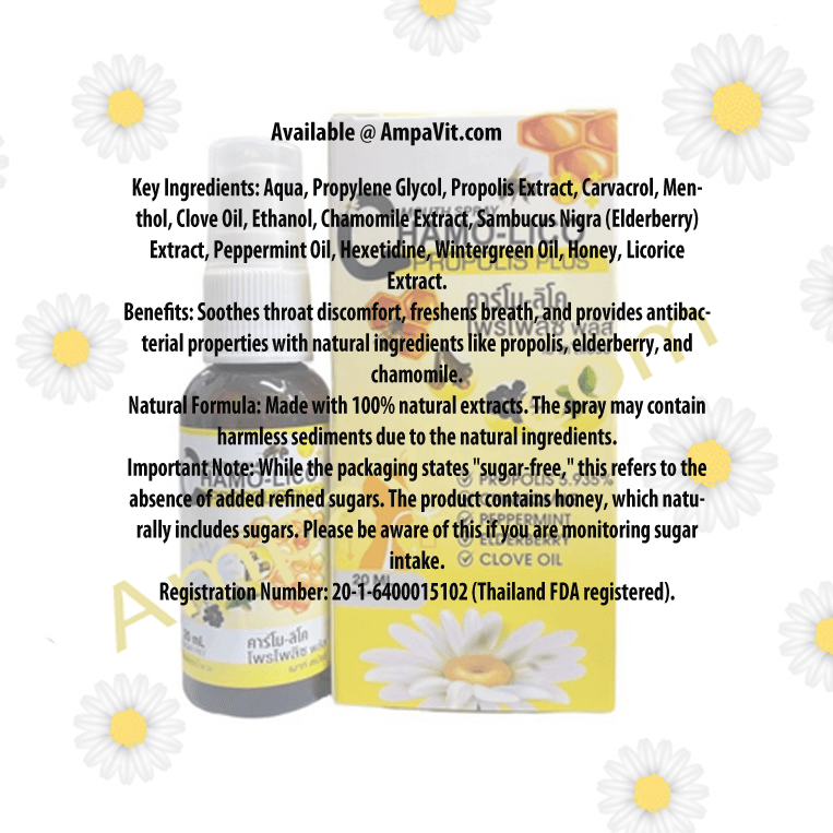 • Important Note: The “sugar-free” label means there are no added refined sugars. However, the presence of honey means natural sugars are still in the formula. Therefore, customers managing their sugar intake should take note when using Chamo-Lico Mouth Spray.