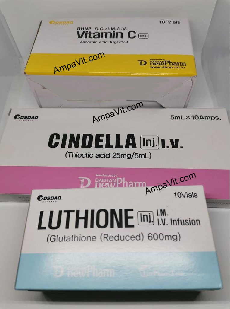 3 Box set Set includes:Luthione 600​ mg ( 10 Vials) VitaminC 10,000 mg ( 10 Vials) 20ml per vial,Cindella (Thioctic Acid 25mg) ( 10 Amps)