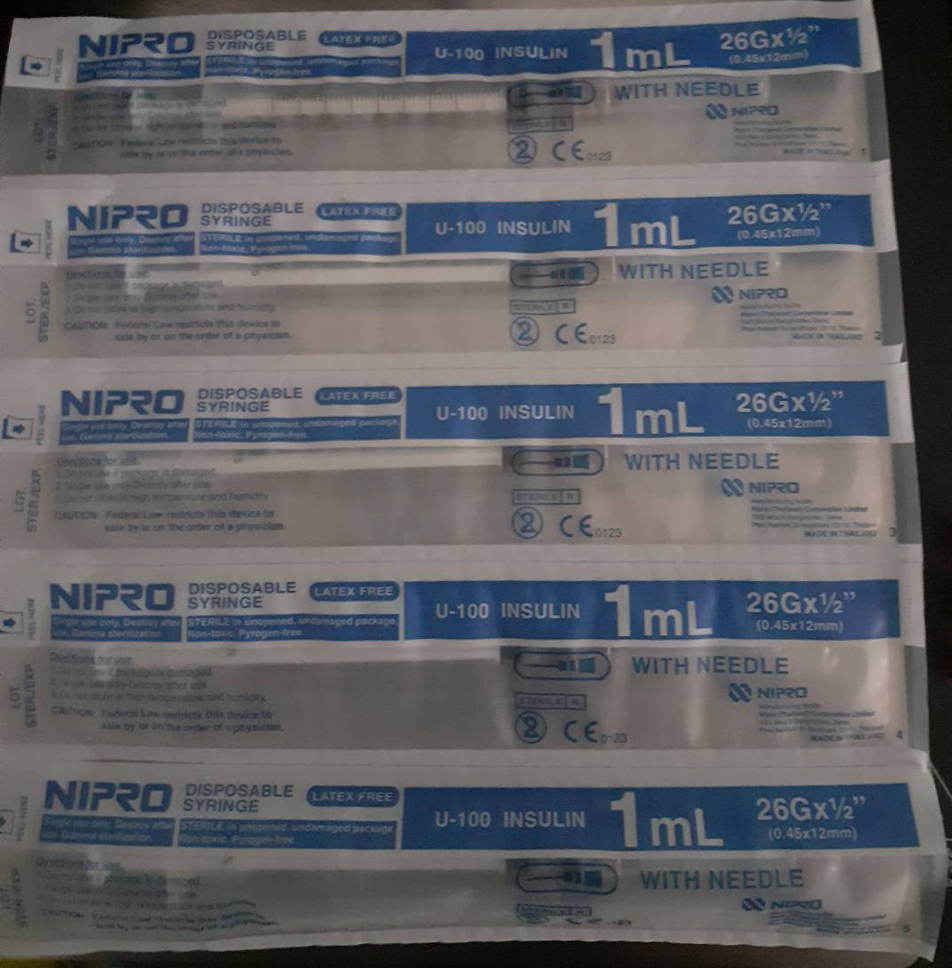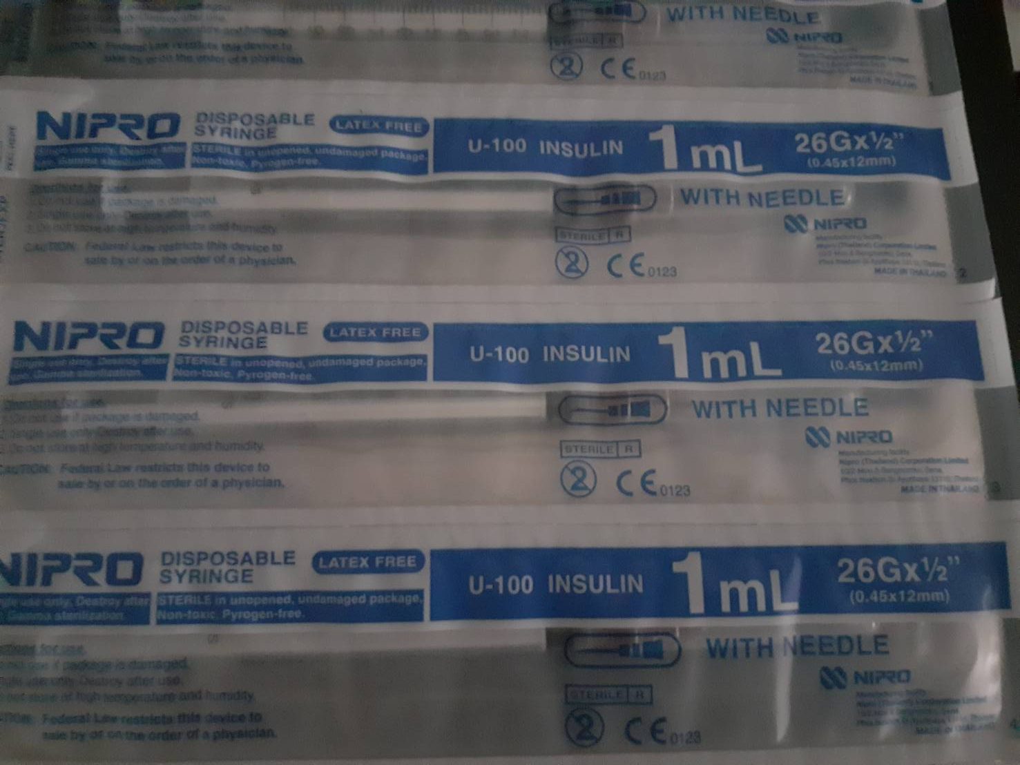 Pack of 10 U-100 Insulin Hypodermic Needles 29G x 1⁄2 Brand: NIPRO Disposable Syringe complete with needle. 0.33 X 13mm. Sterile and Sealed.